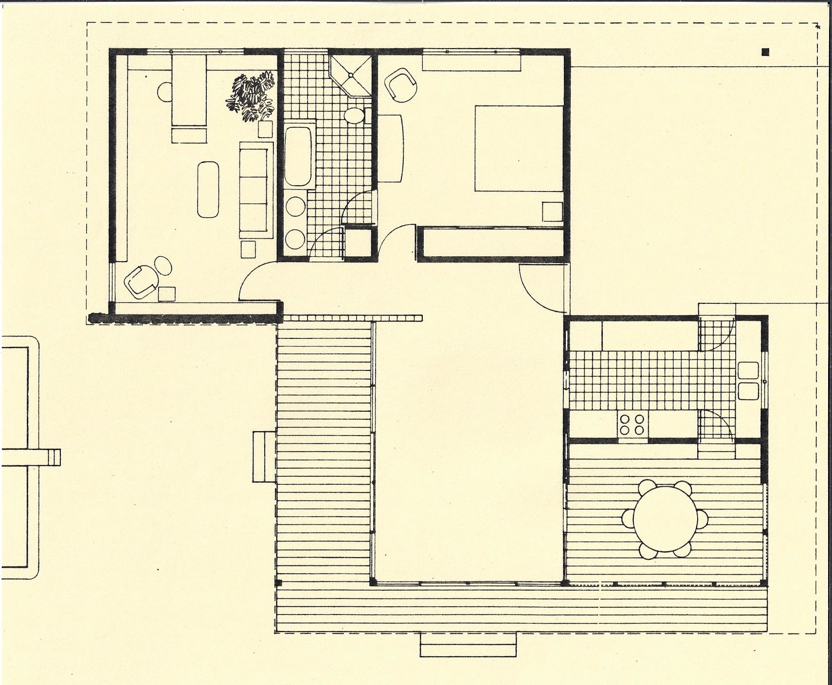 The plan combined the hermetic, sealed areas, at top, with the very open, sliding glass doors and screened living, dining and kitchen areas. Slipping these two masses past each other, a simple hipped roof (dotted line) provides a carport at upper right, and notching the roof at at bottom left gestures toward the pool.