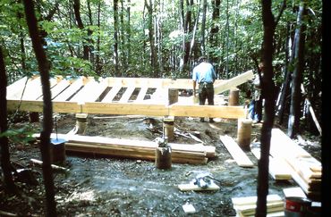 The building site is across a pond from the parking area, hence the bridge approach. The advantage of coming into a tall house in the middle is it minimizes climbing inside the house.