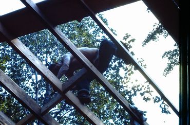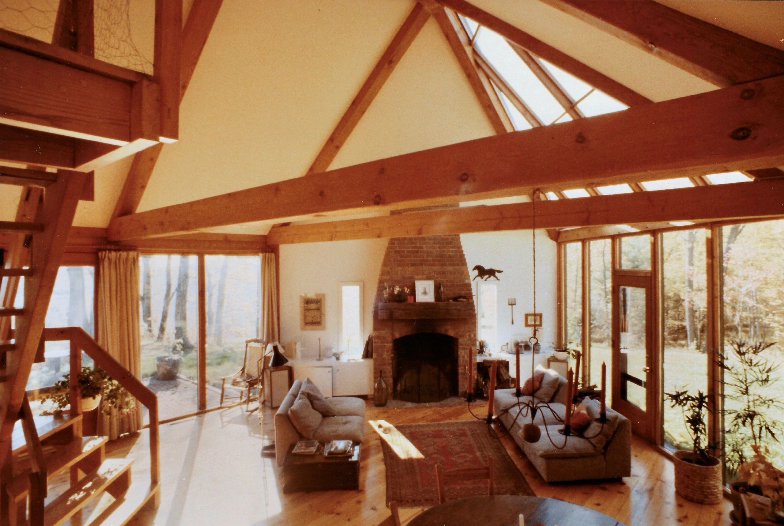 The horizontal windows capturing the panoramic vista, and the generous skylight bringing in a view of the tall trees. Note the stairs to the children's sleeping loft.