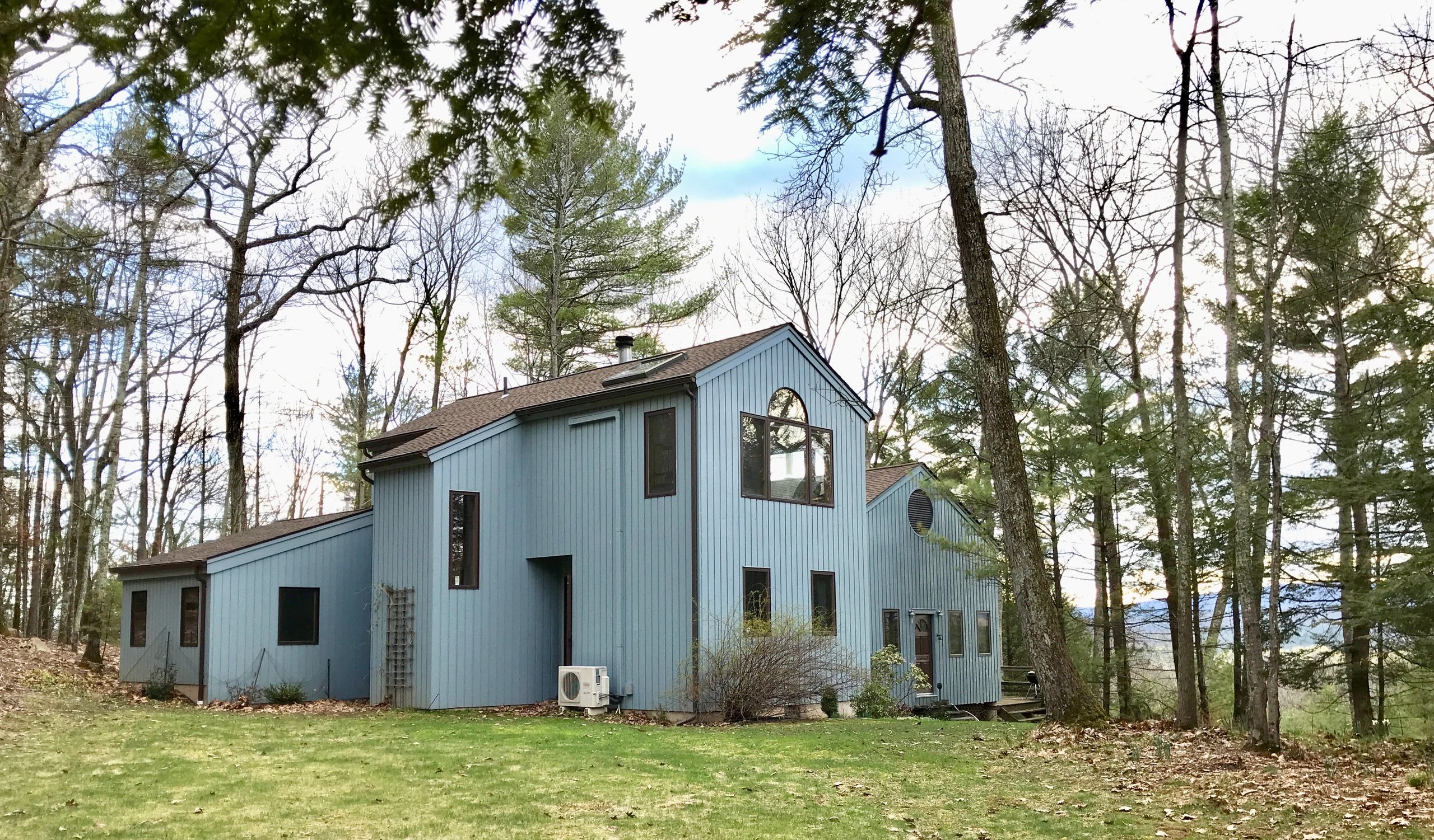 The 'simple barn' was tweaked at each end by 45 degrees. One end became the master bedroom projection, while the other end allowed a slanted skylight oriented to the woods behind the house.